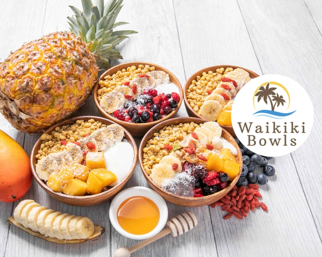 ブラジル発祥のアサイーボウルをハワイスタイルで提供しており、カスタムボウル、クラシックボウル、スペシャルボウルなど豊富なバリエーションが魅力です。ミディアムサイズ(約250g)とフルサイズ(約350g)から選べ、共通食材としてアサイースムージー、ヨーグルト、バナナ、グラノーラ、ゴジベリー、スーパーフード、ココナッツファイン、はちみつが使用されています。