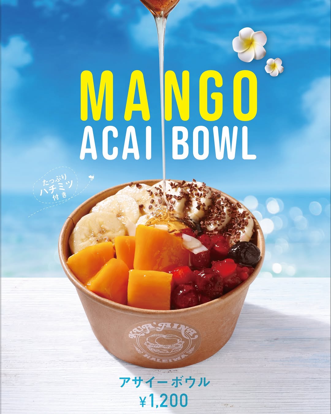 オアフ島ノースショア発祥のハンバーガーチェーンが手がけるアサイーボウルです。夏季限定メニューとして、マンゴー、バナナ、ミックスベリー、グラノーラ、ココナッツチップス、カカオニブを使った本格的なアサイーボウルを1,200円で提供。